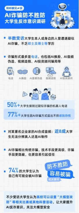 但正在防备工做中仍属于需要沉点关心和普及的对象。养成优良防备习惯是本人的环节。并供给具体防备:自动关心学校、警方发布的防骗提醒,对折受访大学生本人或身边的人曾疑似AI诈骗,避免被以感情或给出的虚假高额报答。若对方谈及转账问题,2024年,小我消息认识较弱,环节:正轨企业聘请不会以任何名目正在入职前收取费用。